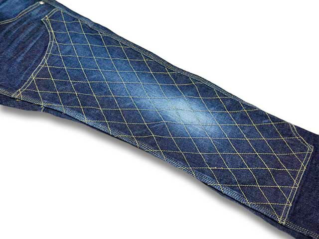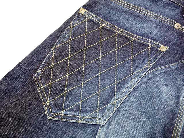 【インディゴデニム(ヴィンテージフィニッシュ)】 【膝部はキルティングステッチを施したダブルニー仕様でバックポケットにもキルティングステッチが施されます。