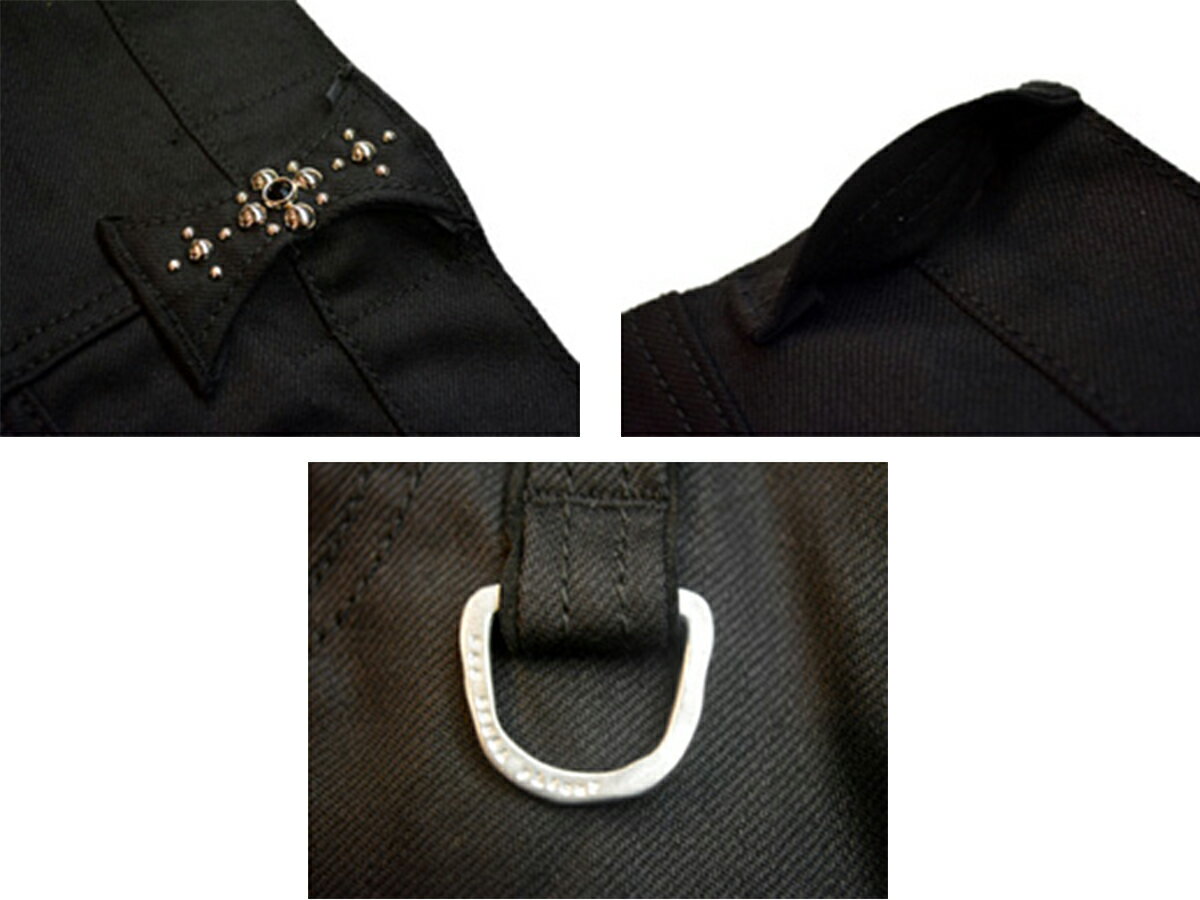 右前のベルトループにシルバー製Dカン、センターループには手打ちのスタッズをあしらい、全てのベルトループ裏に革を敷き強度を高めているという拘り。