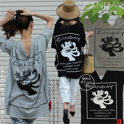 <パケット便です>【ビッグTシャツ CANDAYプリント】 ゆったりなのに着痩せ? Tシャツ チュニック ワイドポケット付き 体型カバー