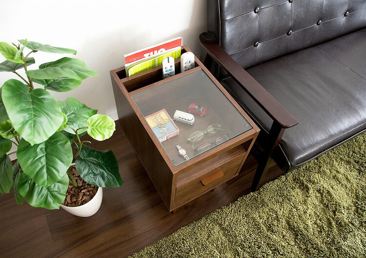 サイドテーブル 収納付きのポイント ■リモコンや小物が収納できる木製のサイドテーブル ■ガラスの天板がコレクションケースになるテーブル ■ソファサイドテーブルとしてカフェテーブルに最適 ■北欧のインテリアに馴染む脚付きのソファテーブル ■ウォールナットのような天然木のアンティーク感! ■引き出しがあるし収納棚は見せる収納のラックです ■雑誌やリモコンは立てて置ける便利な収納ボックス ■ベッドサイドテーブルとしてぴったりな完成品です ■電話台やファックス台、玄関収納としても使えます ■コンパクトなコーヒーテーブルでリビング収納兼用 ■ブラウン色の木製サイドテーブルは掃除が楽な高さソファに座りながら、お気に入りを眺めたい。